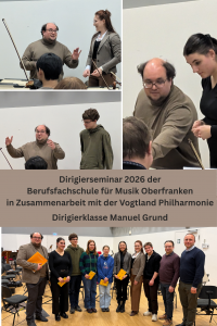 In Zusammenarbeit mit der Vogtland Philharmonie durfte die Berufsfachschule für Musik Oberfranken ein ganz besonderes Dirigierseminar erleben. Die Schülerinnen und Schüler der der Dirigierklasse von Manuel Grund sammelten dabei erste